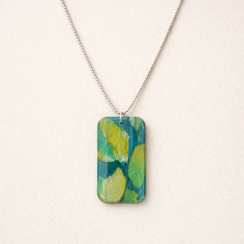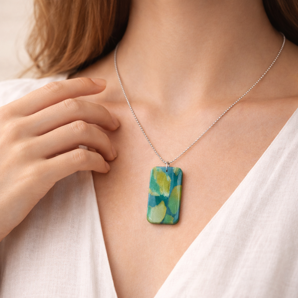 Handcrafted from polymer clay and finished with a glossy resin coat, each piece carries natural variations in color and pattern—intentional imperfections that make every piece one of a kind. The stainless steel ball chain rests comfortably at the collarbone, making this an easy, everyday necklace with character.
