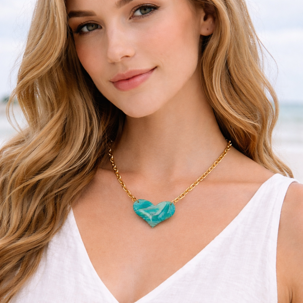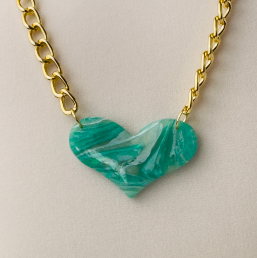 Handcrafted from polymer clay and finished with a glossy resin coat, each piece carries natural variations in color and pattern—intentional imperfections that make every piece one of a kind. The gold-filled chain rests comfortably at the collarbone, making this an easy, everyday necklace with character.