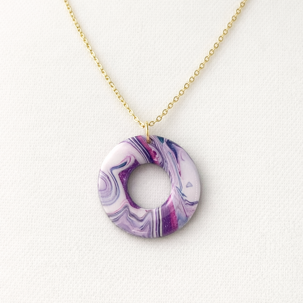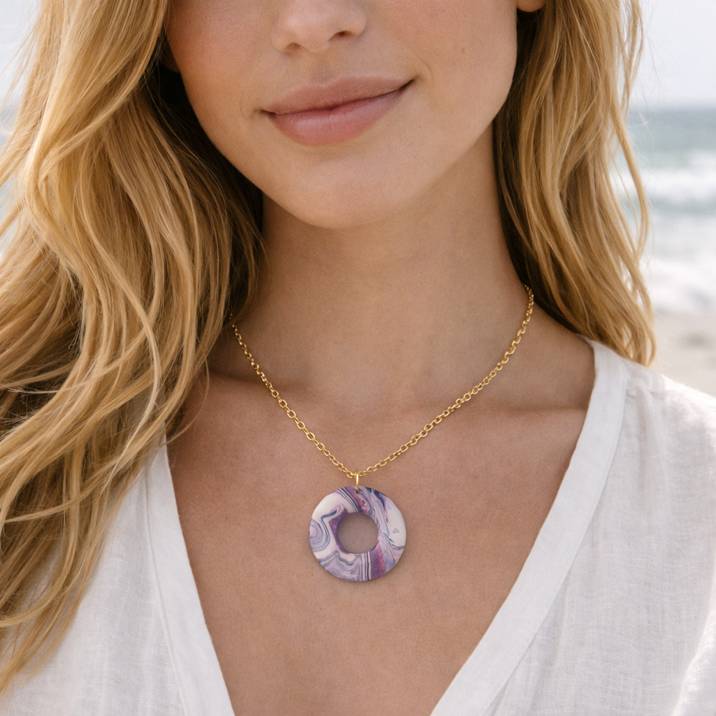 Handcrafted from polymer clay and finished with a glossy resin coat, each piece carries natural variations in color and pattern—intentional imperfections that make every piece one of a kind. The gold-filled chain rests comfortably at the collarbone, making this an easy, everyday necklace with character.