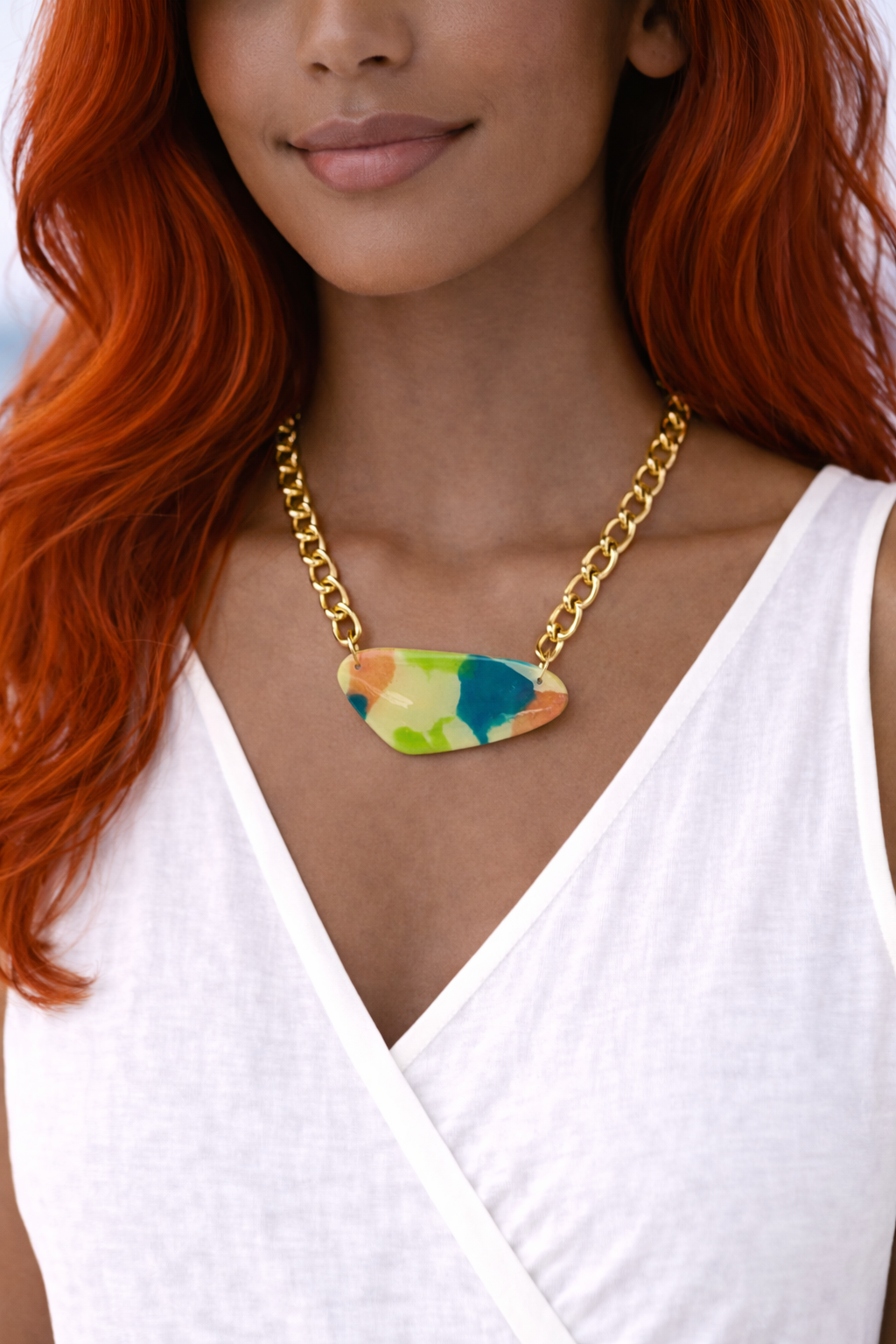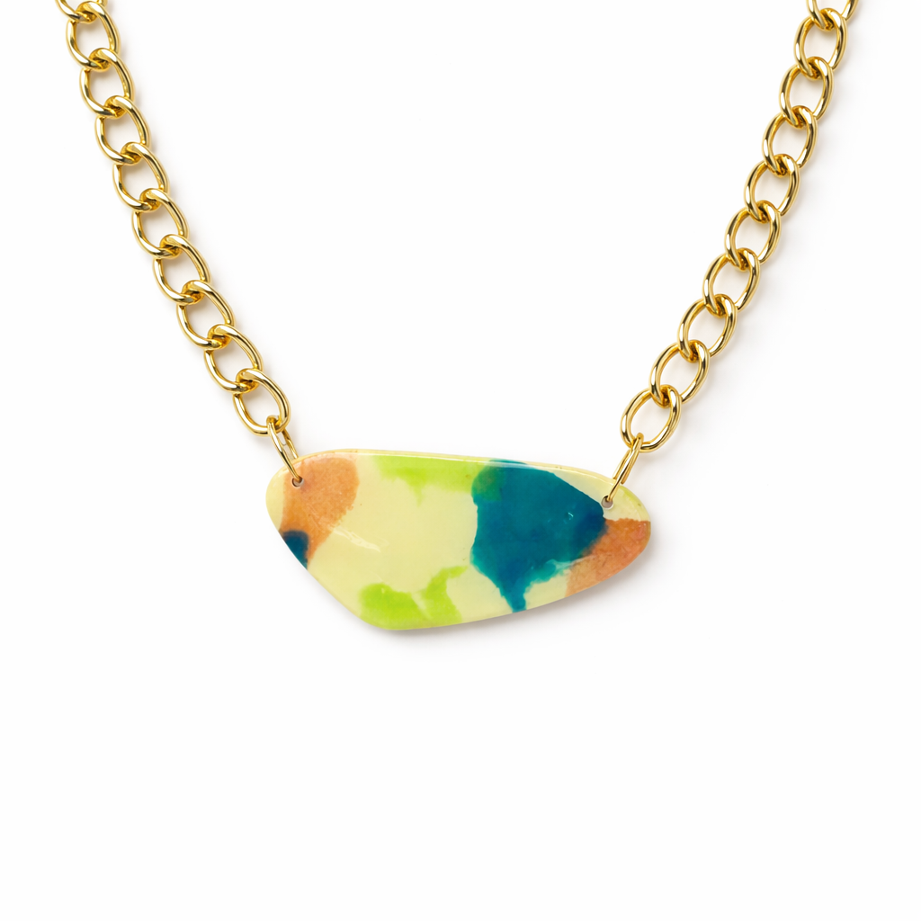 Handcrafted from polymer clay and finished with a glossy resin coat, each piece carries natural variations in color and pattern—intentional imperfections that make every piece one of a kind. The gold-filled chain rests comfortably at the collarbone, making this an easy, everyday necklace with character.