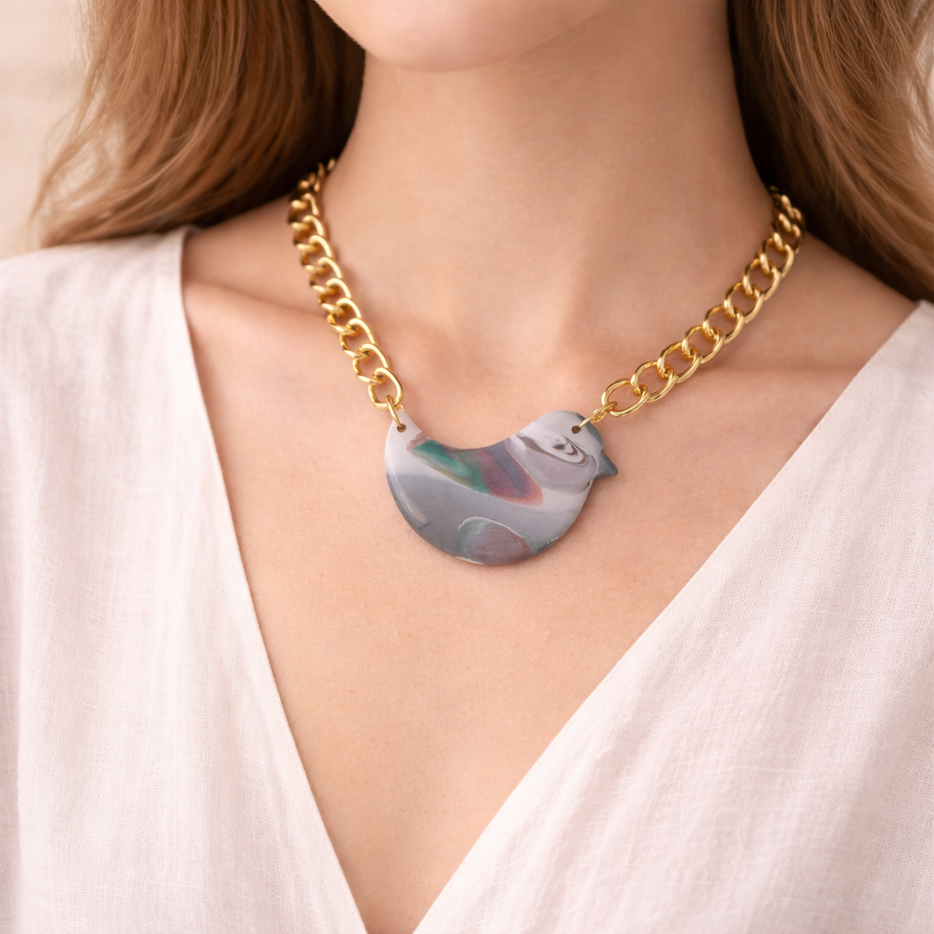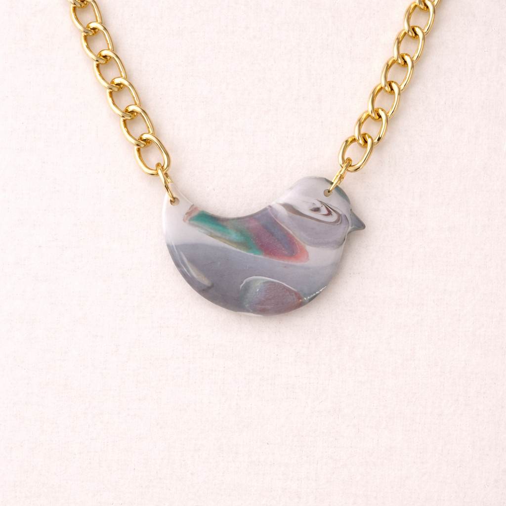 Handcrafted from polymer clay and finished with a glossy resin coat, each piece carries natural variations in color and pattern—intentional imperfections that make every piece one of a kind. The gold-filled chain rests comfortably at the collarbone, making this an easy, everyday necklace with character.