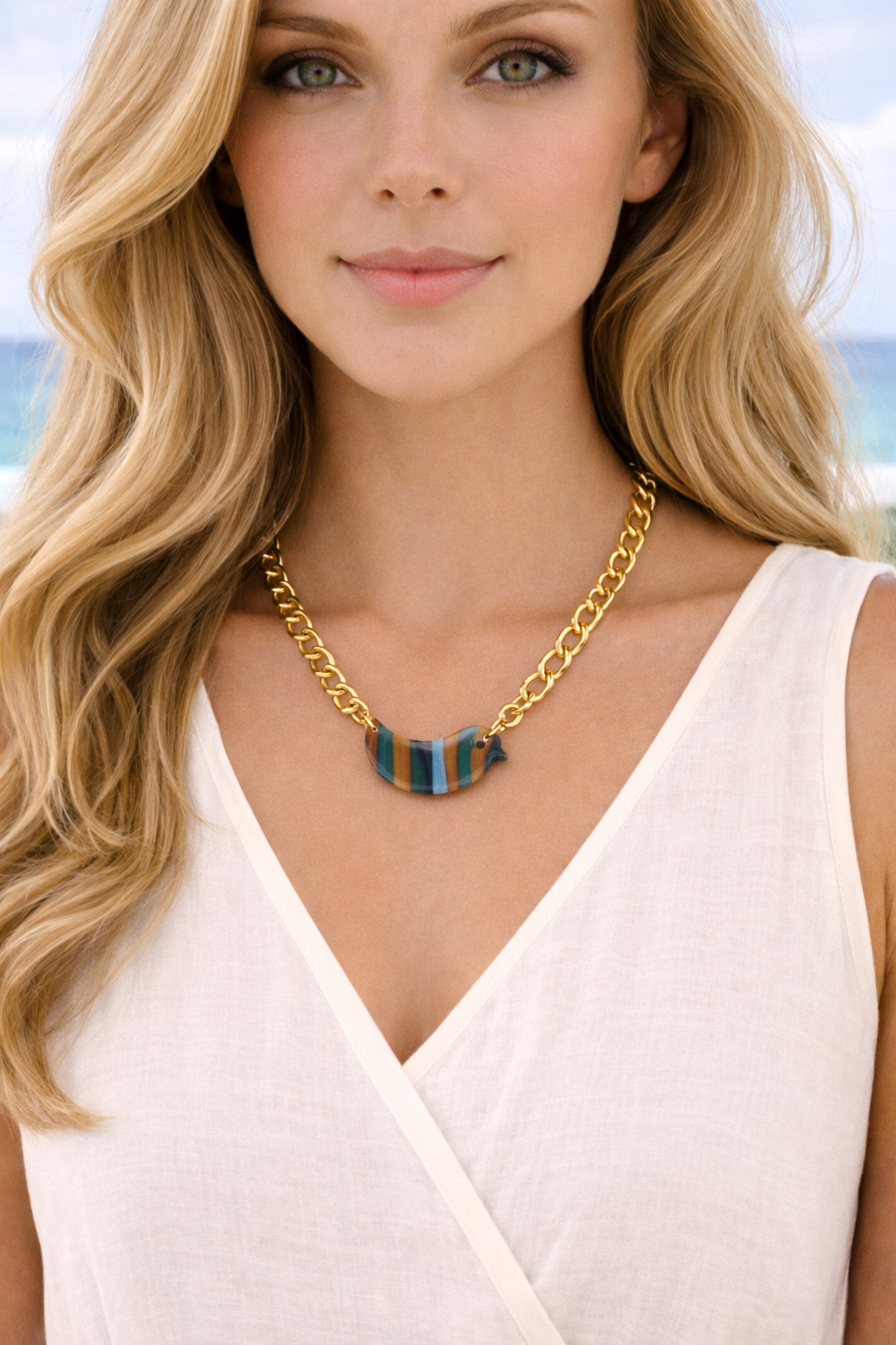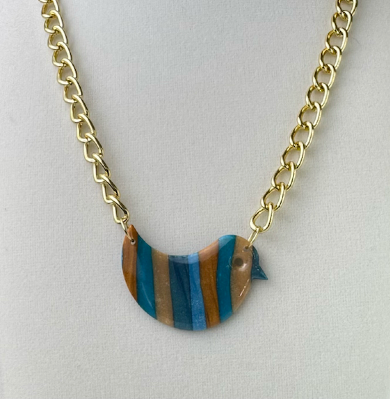 Handcrafted from polymer clay and finished with a glossy resin coat, each piece carries natural variations in color and pattern—intentional imperfections that make every piece one of a kind. The gold-filled chain rests comfortably at the collarbone, making this an easy, everyday necklace with character.