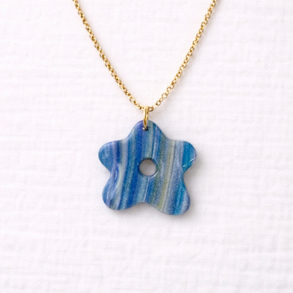 Handcrafted from polymer clay and finished with a glossy resin coat, each piece carries natural variations in color and pattern—intentional imperfections that make every piece one of a kind. The gold-filled chain rests comfortably at the collarbone, making this an easy, everyday necklace with character.